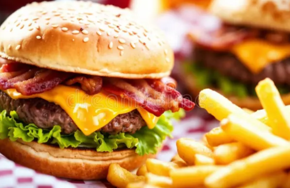 2 HAMBURGUESAS CON QUESO Y TOCINO AL PLATO CON PAPAS FRITAS Y ENSALADA
